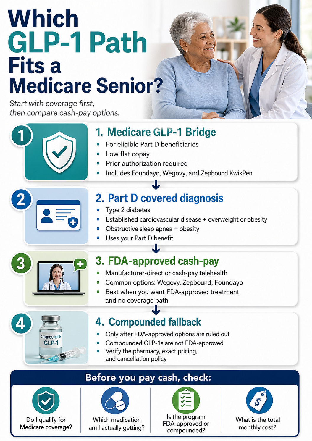 If you’re on Medicare and searching for the best cash-pay GLP-1 for seniors on Medicare, here is the honest answer before you scroll another inch. Most Medicare seniors should check three things before paying a dollar of cash. First, whether you qualify for the Medicare GLP-1 Bridge — it launches July 1, 2026 with a $50/month copay for eligible Foundayo, Wegovy (injection and tablets), and Zepbound KwikPen prescriptions, and on April 21, 2026 CMS extended the program through December 31, 2027 after the original BALANCE Model was canceled in Medicare Part D for 2027. Second, whether you have a Part D-covered indication (type 2 diabetes, established CVD, or moderate-to-severe sleep apnea). Third, if neither applies, FDA-approved cash-pay starts at $149/month for Wegovy pill or Foundayo (lowest dose) through NovoCare, LillyDirect, or Ro Body.