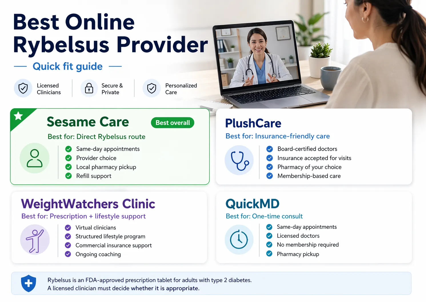The best online Rybelsus provider for most people in 2026 is Sesame Care. It’s the one online route we verified that has a dedicated Rybelsus prescription page, same-day visit availability, your choice of licensed clinician, local pharmacy pickup, and refill handling inside a simple subscription. PlushCare is the stronger pick if you want an insurance-friendly doctor visit with prior-authorization support. WeightWatchers Clinic fits if you want a structured lifestyle program alongside the prescription. QuickMD works if you want a one-off $99 consult without membership friction.