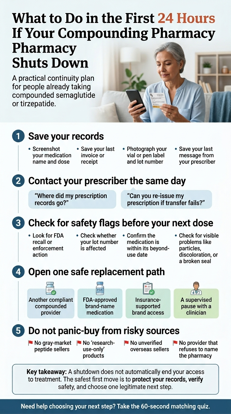 This guide is for: people already taking compounded semaglutide or tirzepatide who just got a closure email, a canceled refill, a warning-letter scare, or saw headlines about their provider.