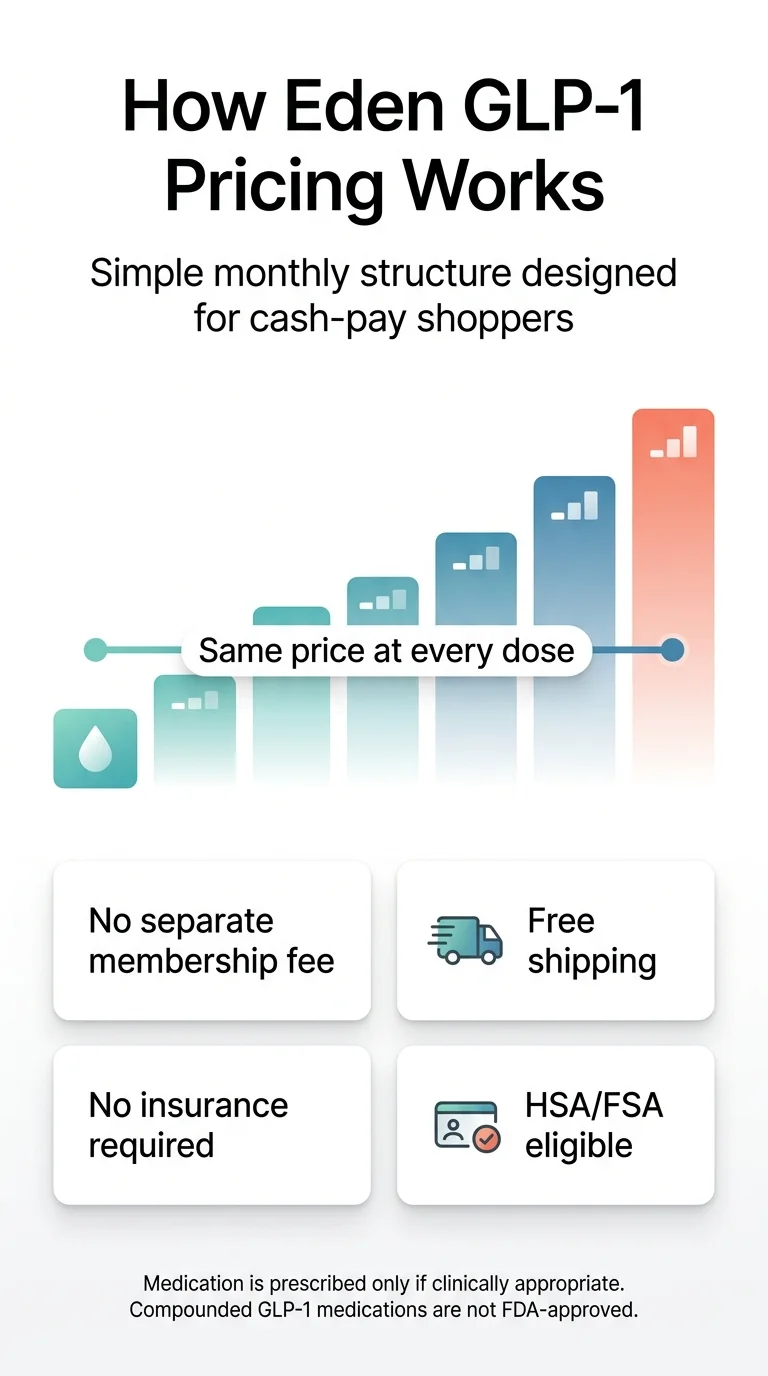 Here's the part most sites skip: Eden's "same price at every dose" promise means your bill stays flat even as your provider increases your dosage — and that's genuinely rare. Over a typical 6–12 month GLP-1 treatment where your dose gradually increases, that flat structure can add up to real savings compared to providers who charge more at higher doses.