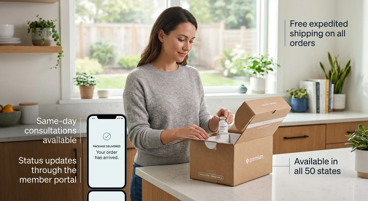 Medication “arrives within 3–5 business days when home delivery is used.” This appears to describe the pharmacy-plus-transit window after approval — not the total time from signup. Plausible as a post-approval best-case, but not the from-signup number.