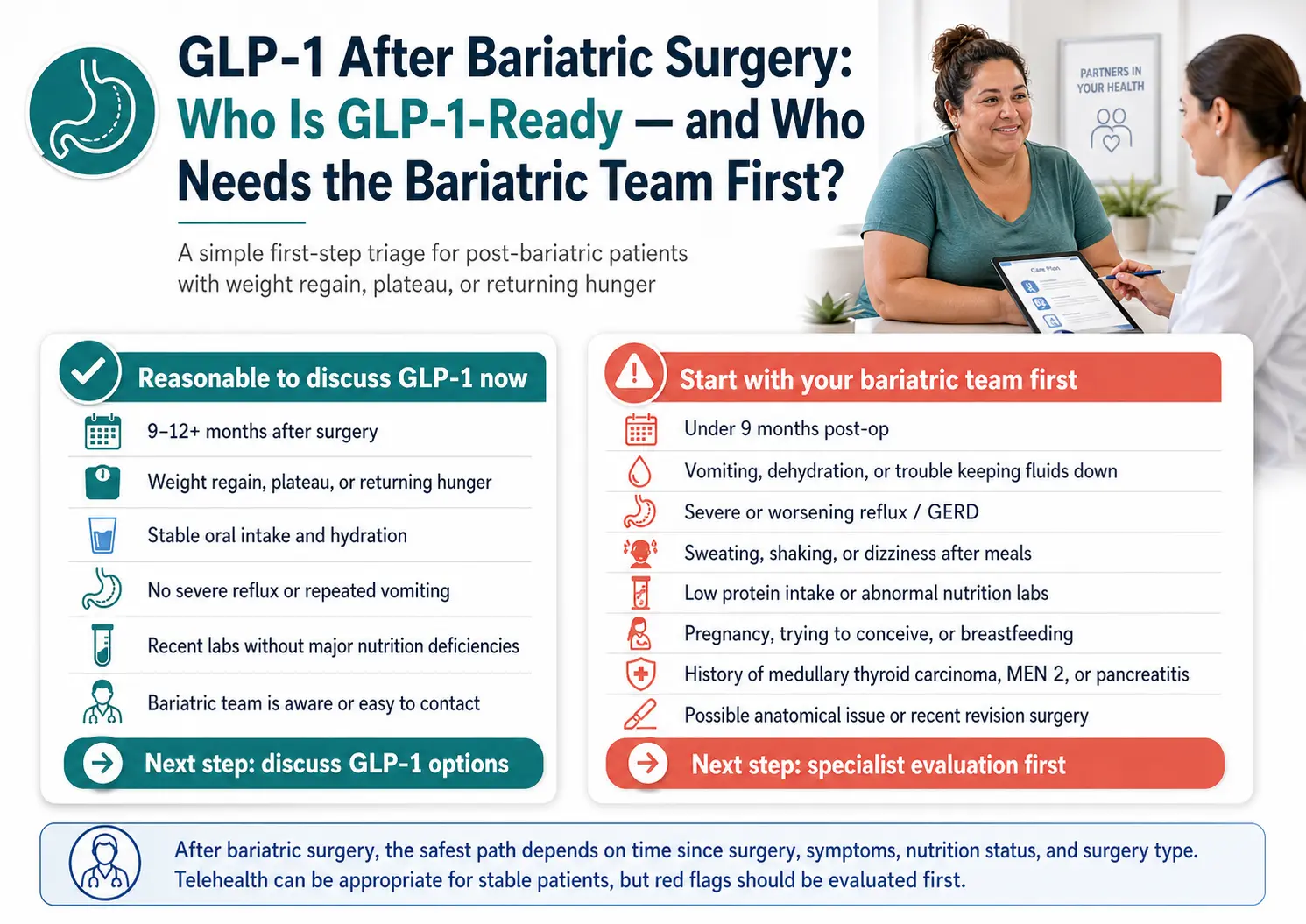 If you're less than nine months post-op, currently vomiting or dehydrated, dealing with severe reflux, experiencing hypoglycemia symptoms, eating poorly with low nutrition labs, pregnant, or have a history of medullary thyroid carcinoma or pancreatitis, do not start with a telehealth checkout. Your first appointment should be with your bariatric surgery team, an obesity medicine specialist, or your primary care provider — not an online intake form. Telehealth may still be appropriate for you later, but these issues need bariatric-aware evaluation first.