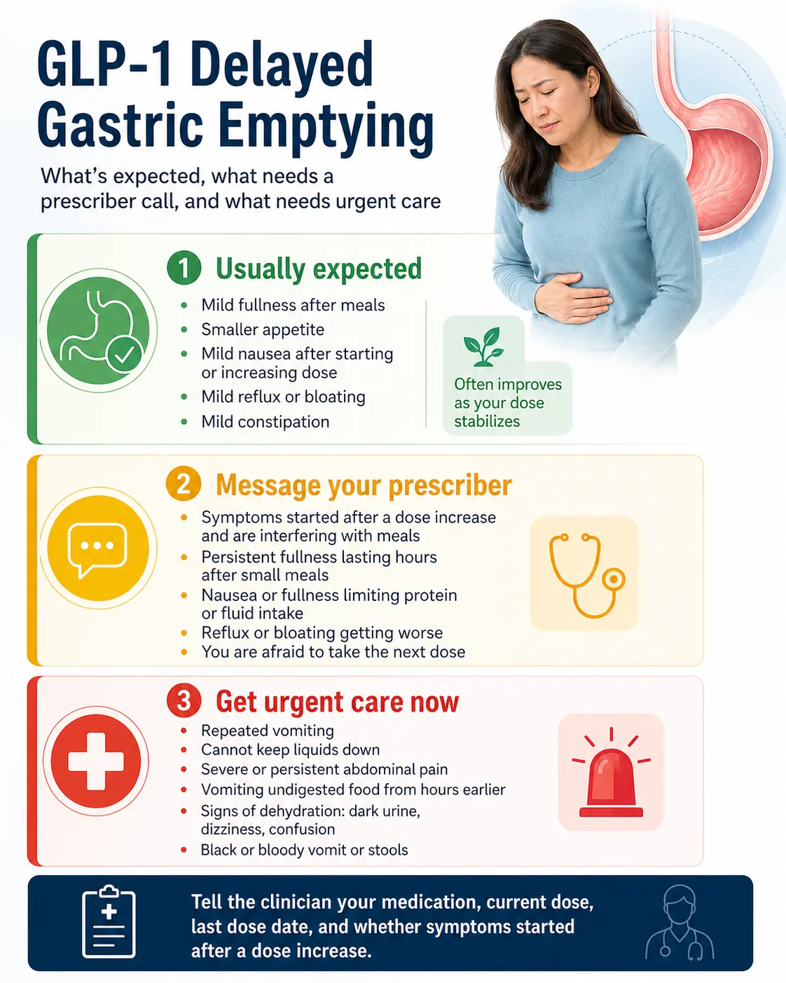 Get my personalized GLP-1 action plan →If you’re vomiting persistently, dehydrated, in severe pain, or have an upcoming procedure, please contact a clinician — don’t take a quiz.