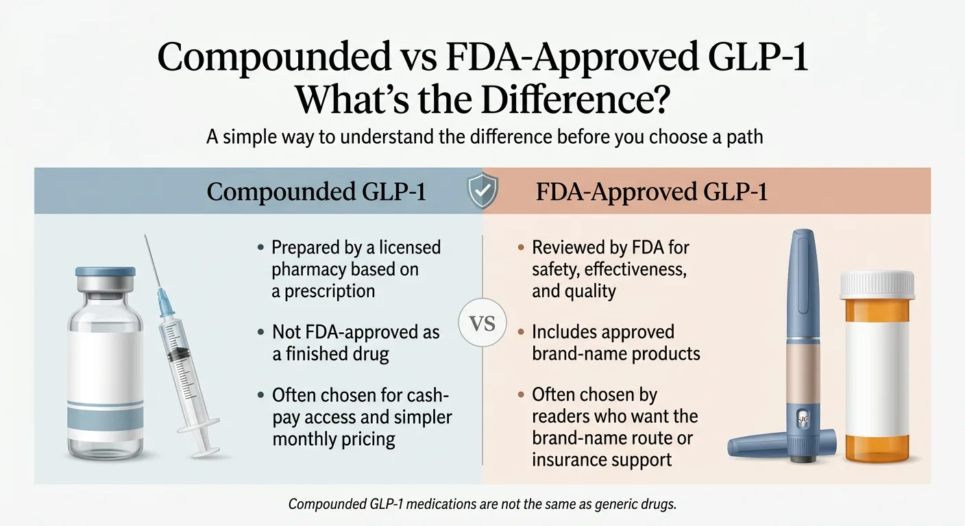 Why people choose FDA-approved: Peace of mind. If medication quality assurance and the backing of full clinical trials matter most to you, the FDA-approved route is the right choice. And with the Wegovy pill now available at $149/month through cash-pay programs and Zepbound at $299/month through Lilly, brand-name access is more affordable than it was a year ago.