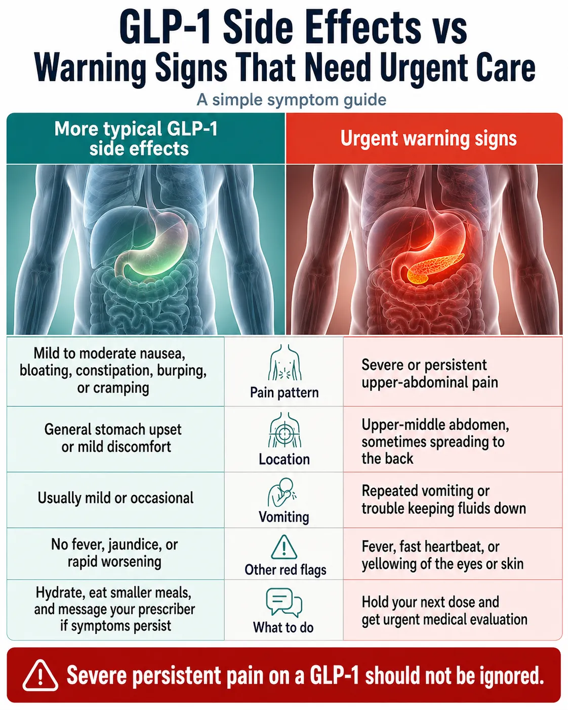 Normal GLP-1 GI side effects are mild to moderate, come and go with meals, ease with hydration and smaller portions, and improve as your body adjusts to the dose. Pancreatitis pain is sudden, severe, constant, located in the upper-middle abdomen, often radiates straight to the back, and doesn’t respond to position changes or OTC remedies. If your pain pattern fits the third or fourth columns below, treat it as an emergency.
