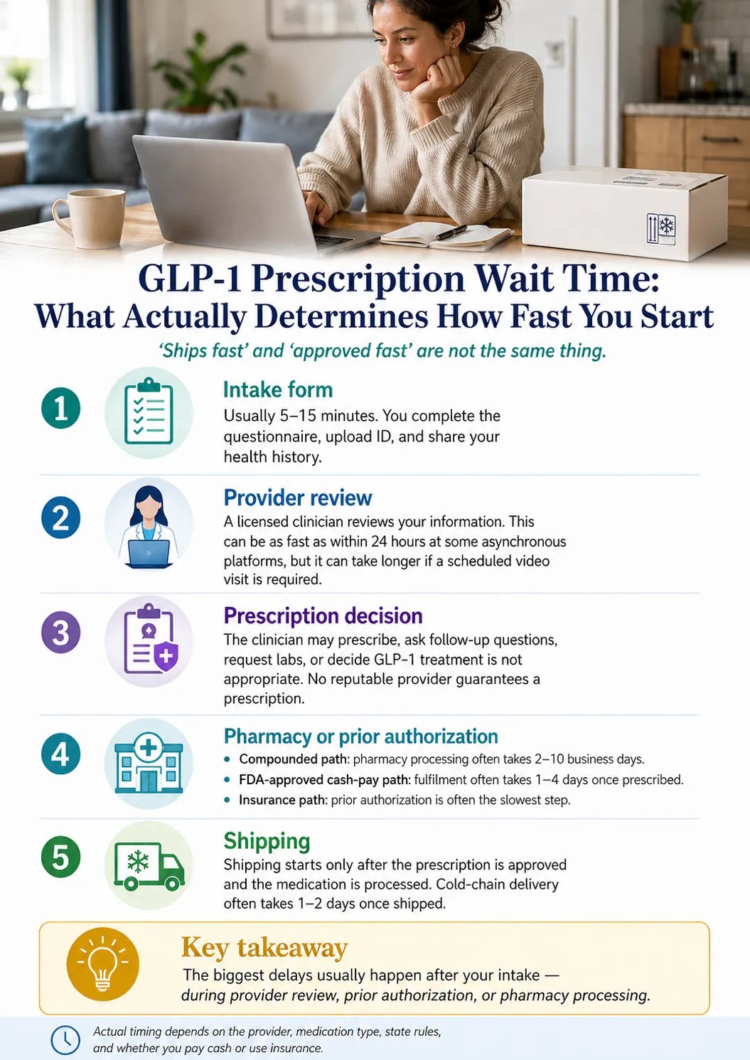 What this page covers and doesn’t. This guide focuses on prescription approval and first-dose timelines — the part most providers blur with shipping speed. If you already have approval and only care about how fast medication ships, see our companion guide to GLP-1 providers that ship fastest.