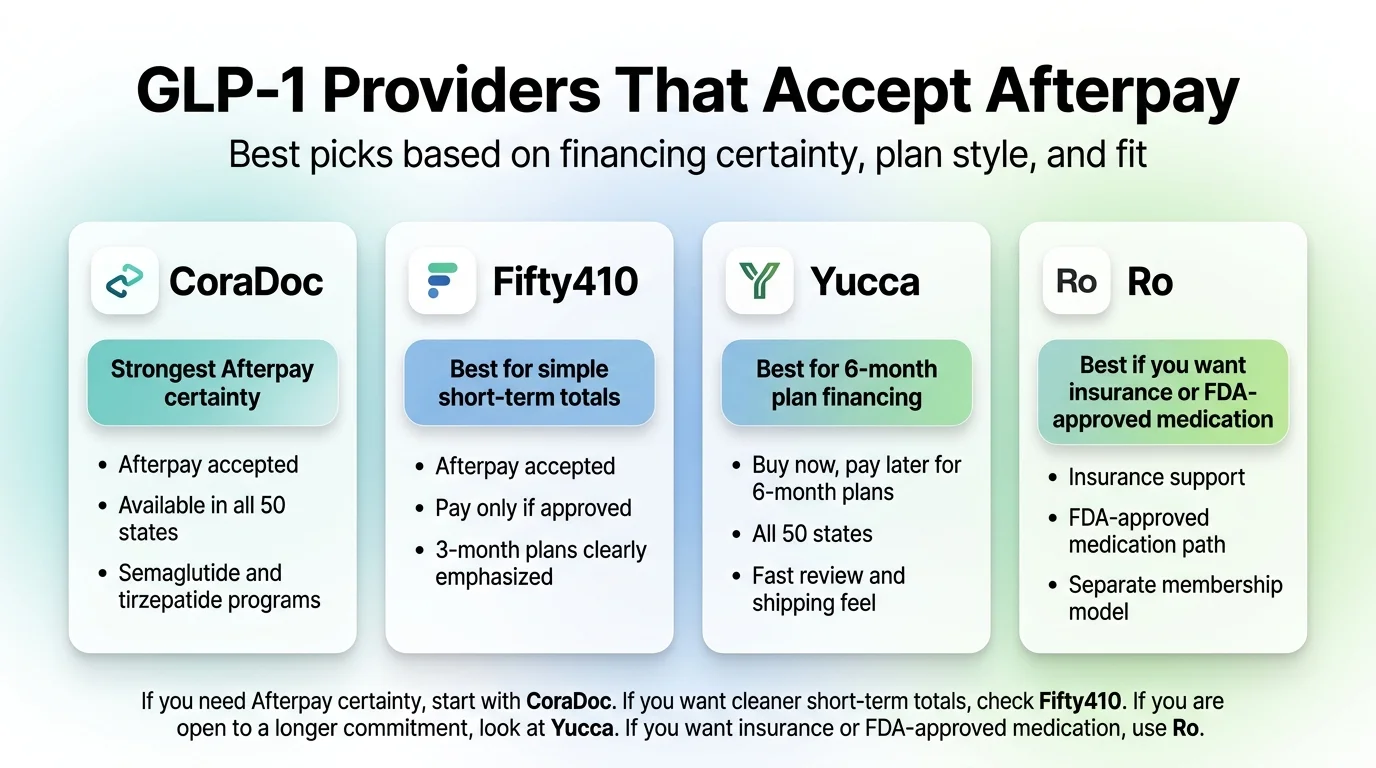 GLP-1 providers that accept Afterpay do exist — but not many, and most of the names you'd recognize don't offer it. After reviewing official pricing pages, checkout flows, and payment documentation across 12+ telehealth providers, we found 5 with hard public Afterpay proof and 1 with softer evidence. The strongest option for most Afterpay shoppers right now is CoraDoc — explicit pay-in-4 language, all 50 states, semaglutide from $99/month, and tirzepatide from $149/month.