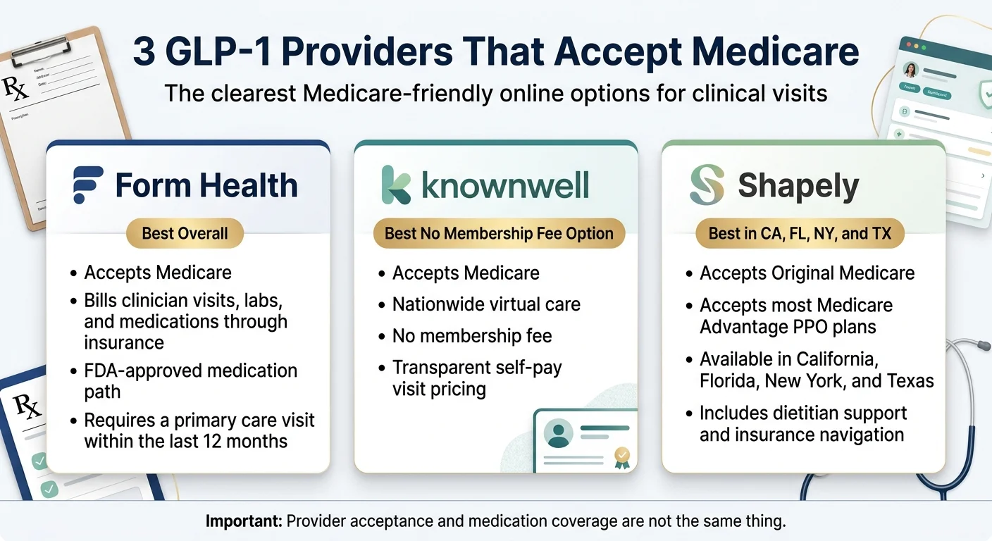 We verified every major online GLP-1 provider's Medicare policy. Only three clearly qualify as GLP-1 providers that accept Medicare for clinical visits right now: Form Health (best overall, 91/100), knownwell (best with no membership fee, 88/100), and Shapely (best if you live in CA, FL, NY, or TX, 76/100).