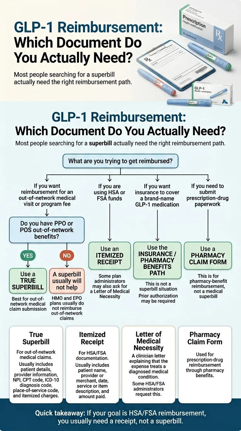 When someone on Reddit says "just request a superbill and submit it," they're usually pulling advice from therapy-billing threads. Therapists often do issue true superbills because therapy reimbursement through out-of-network PPO benefits is a developed use case. GLP-1 telehealth is different. Most of these platforms were built as cash-pay subscription models. Their billing systems generate subscription receipts — not coded medical claim documents. That's not a flaw. It's a business model choice. Subscription receipts are faster to generate, cleaner to dispute, and work perfectly for HSA/FSA documentation. But they will usually get your out-of-network insurance claim rejected.
