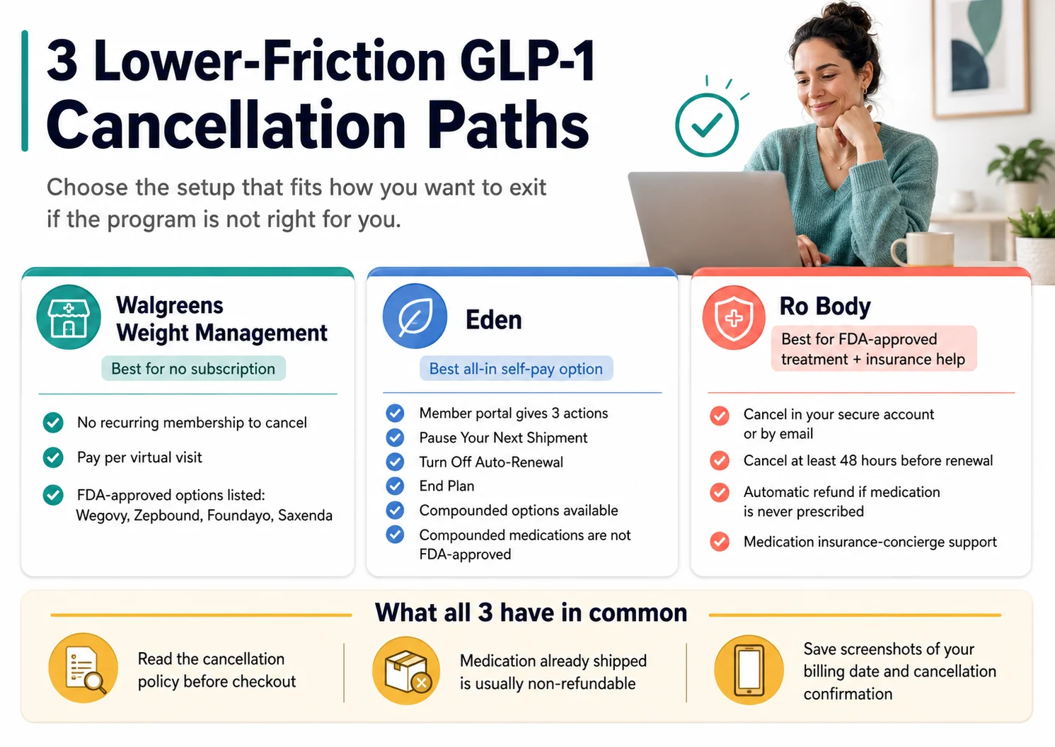 Eden's member portal has the most explicit self-serve cancellation options we found among compounded providers — three distinct actions (Pause, Turn Off Auto-Renewal, End Plan) with no separate membership fee and no phone-call requirement. For FDA-approved medication, Ro Body has the cleanest published policy: two-click cancel from your account, 48 hours' notice, and an automatic refund if medication is never prescribed.