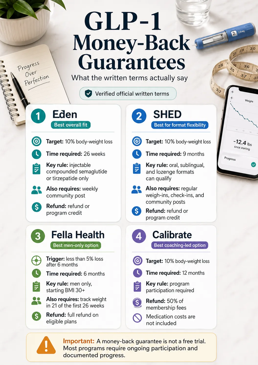 The GLP-1 providers with money-back guarantee terms verified in their published Terms of Service are Eden, SHED, Brightmeds, Fella Health (men only), RemedyMeds, Calibrate, Aayu Well, and LifeMD. TrimRx has a 3-month results guarantee its company has stated publicly, but it isn’t currently published in the formal Terms of Service we could access — confirm directly at signup.