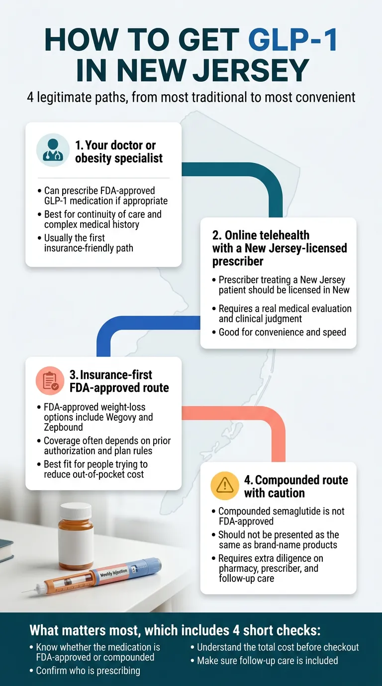 How to get GLP-1 in New Jersey — yes, you can get GLP-1 medication in New Jersey right now, and you probably don't need to visit a doctor's office to start. We spent three weeks verifying every legal path a New Jersey resident can take to get FDA-approved GLP-1 treatment, checking NJ telehealth rules, confirming pricing against provider websites, and reviewing the state's Medicaid coverage. What we found is that most NJ residents are overpaying, choosing the wrong pathway for their situation, or stuck comparing options that aren't even available in their state.