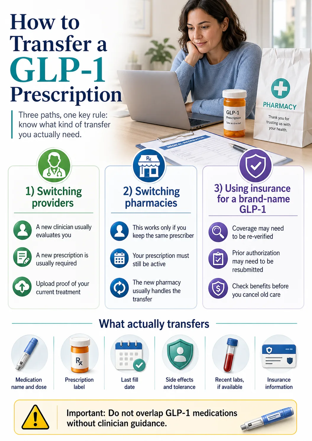Most "how to transfer GLP-1 prescription to a new provider" guides bury the answer under 1,500 words of preamble. Here it is up front: you usually can't transfer a GLP-1 prescription the way you transfer a refill from CVS to Walgreens. A new provider almost always has to evaluate you and write a fresh prescription. What actually transfers is your documentation — your current medication, dose, prescription label, last fill date, side effects, labs, and insurance status.