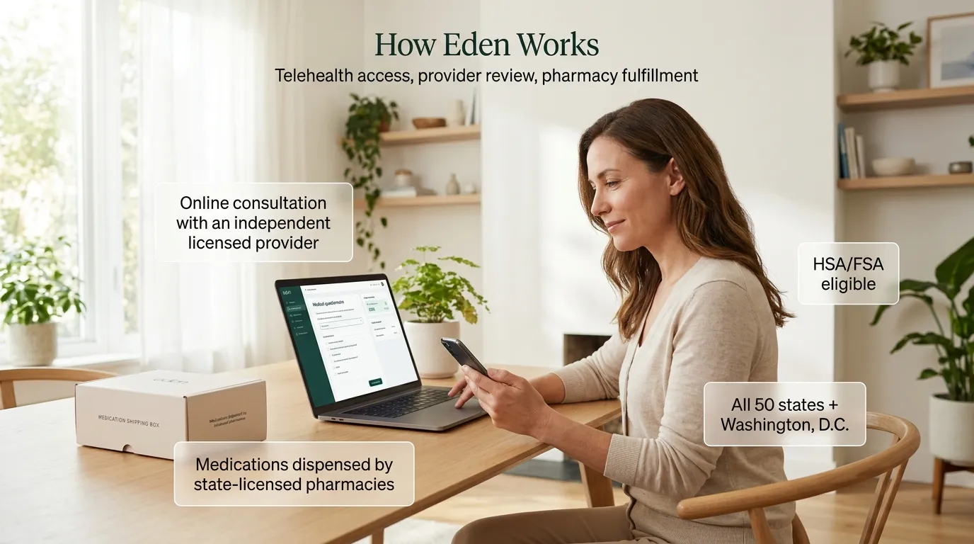 Eden connects you with a licensed prescribing provider — the medication ships to your door from a state-licensed pharmacy.