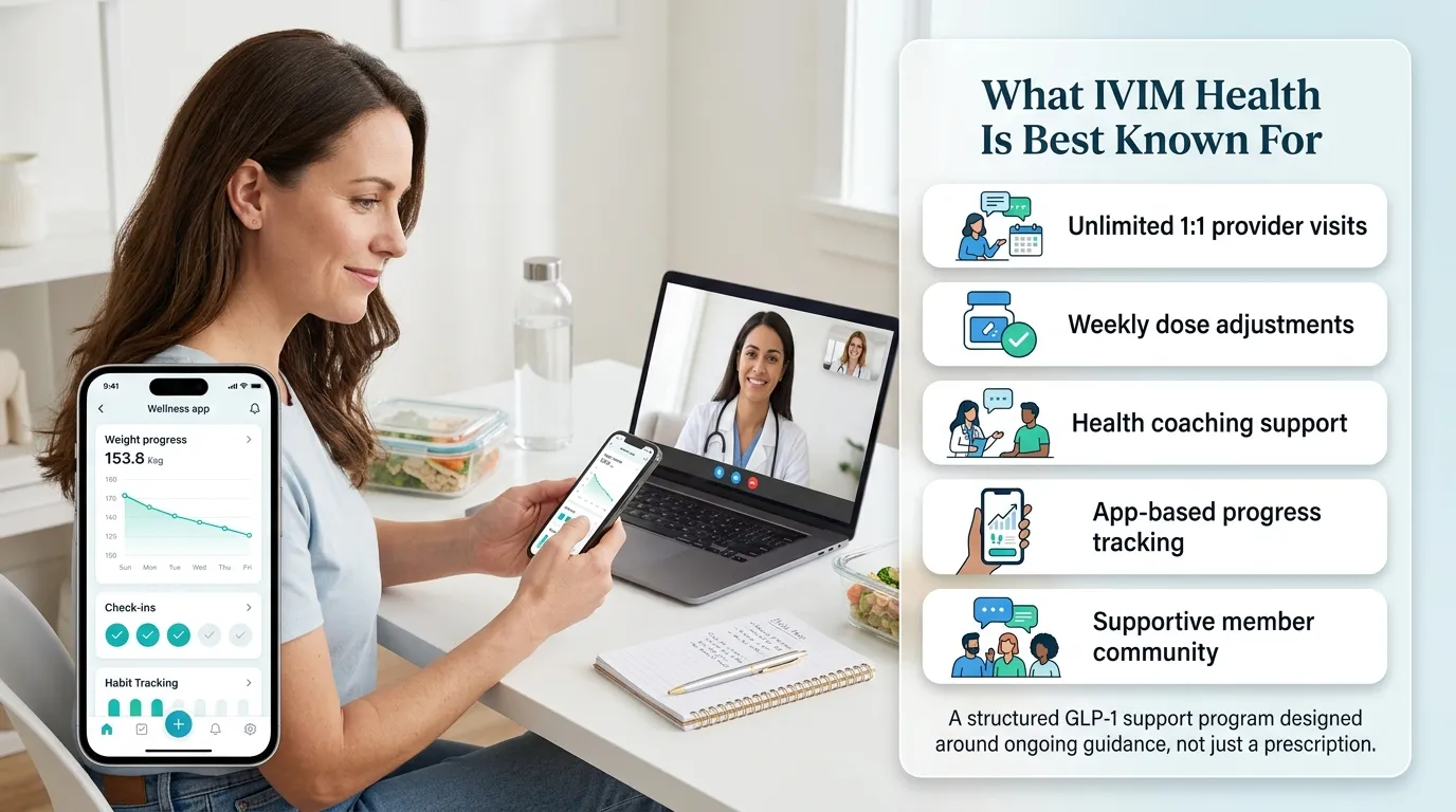 The $75/month membership is the thing that makes IVIM either clearly worth it or clearly not — depending on what you value. The fee covers unlimited provider visits, weekly dose adjustments through IVIM's GLP-1 ID protocol, 1-on-1 health coaching, nutrition support, a mobile app with progress tracking and a meal builder, private member community access, 24/7 clinical support, and 20% off all supplements. The medication is billed on top of that.