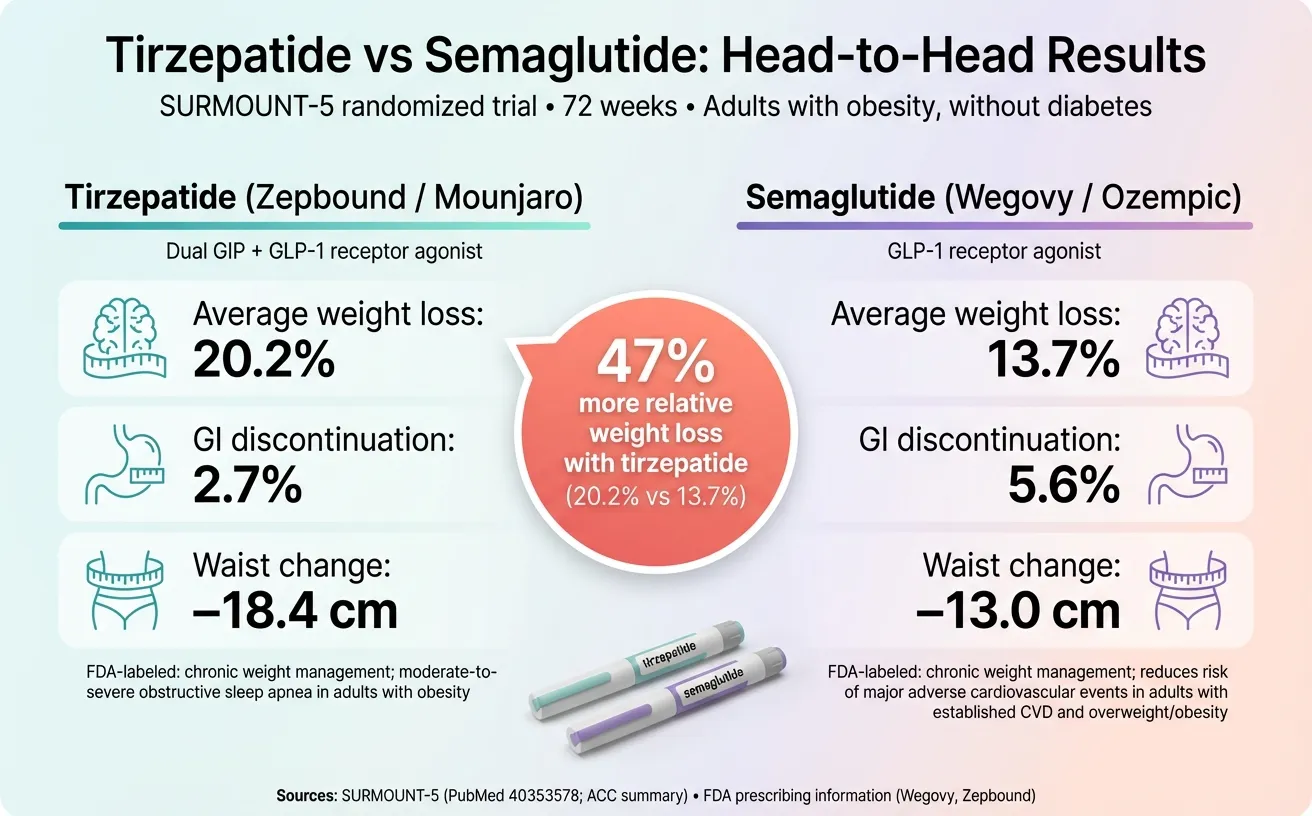If you're comparing MEDVi tirzepatide vs semaglutide, here's the bottom line: start with compounded semaglutide ($179 first month) if you're new to GLP-1 therapy. Semaglutide and tirzepatide are both backed by large clinical trials using brand-name Wegovy and Zepbound — and semaglutide costs significantly less through MEDVi, with room to upgrade later if you hit a plateau. Choose tirzepatide ($349 first month) if you've already tried semaglutide without enough results, need to lose 20%+ of your body weight, or want the most powerful weight loss medication currently studied — the landmark SURMOUNT-5 trial published in the New England Journal of Medicine found tirzepatide produced 47% greater weight loss than semaglutide (20.2% vs 13.7% of body weight over 72 weeks).