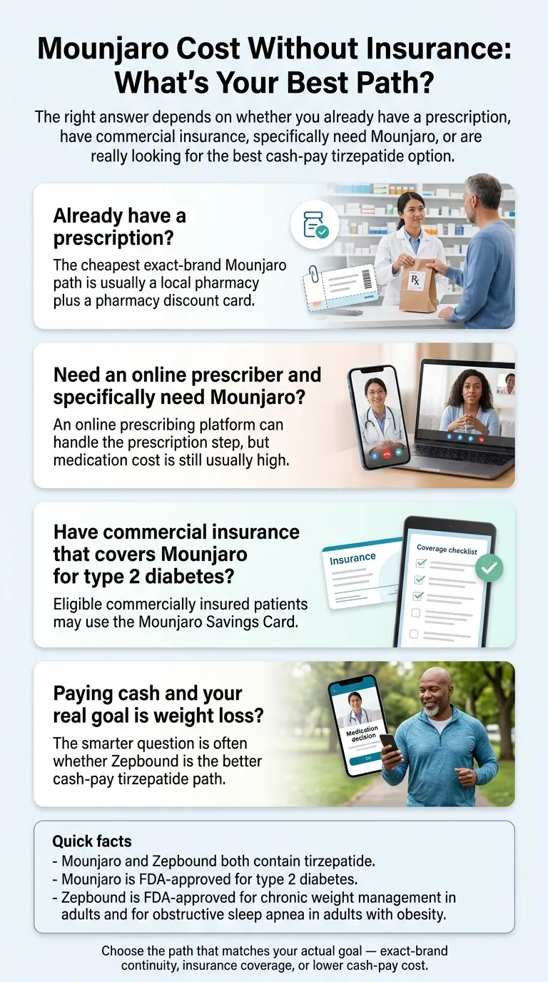 • Uninsured, goal is weight loss → skip Mounjaro, look at Zepbound at $299–$449/month via LillyDirect (same active ingredient, FDA-approved for weight loss)