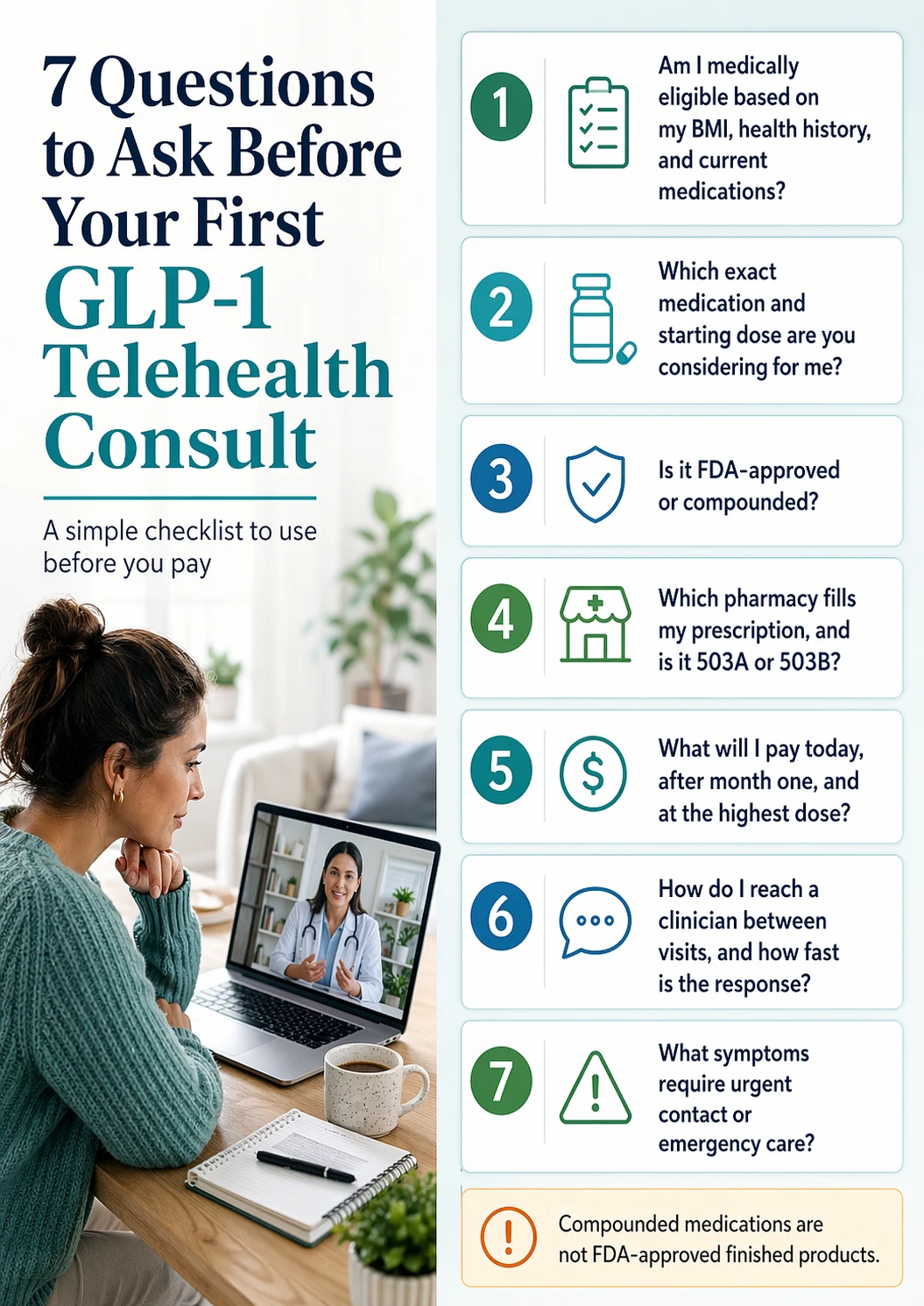 The seven questions to ask before your first GLP-1 telehealth consult that matter most are in the table below. The remaining 23 — sorted by when to ask each one, with the green answer you want to hear, the yellow answer that means "ask a follow-up," and the red answer that means "walk away before paying" — are below that. Our complete 30-point checklist takes about 15 minutes to work through before booking and saves you months of billing or medication surprises.