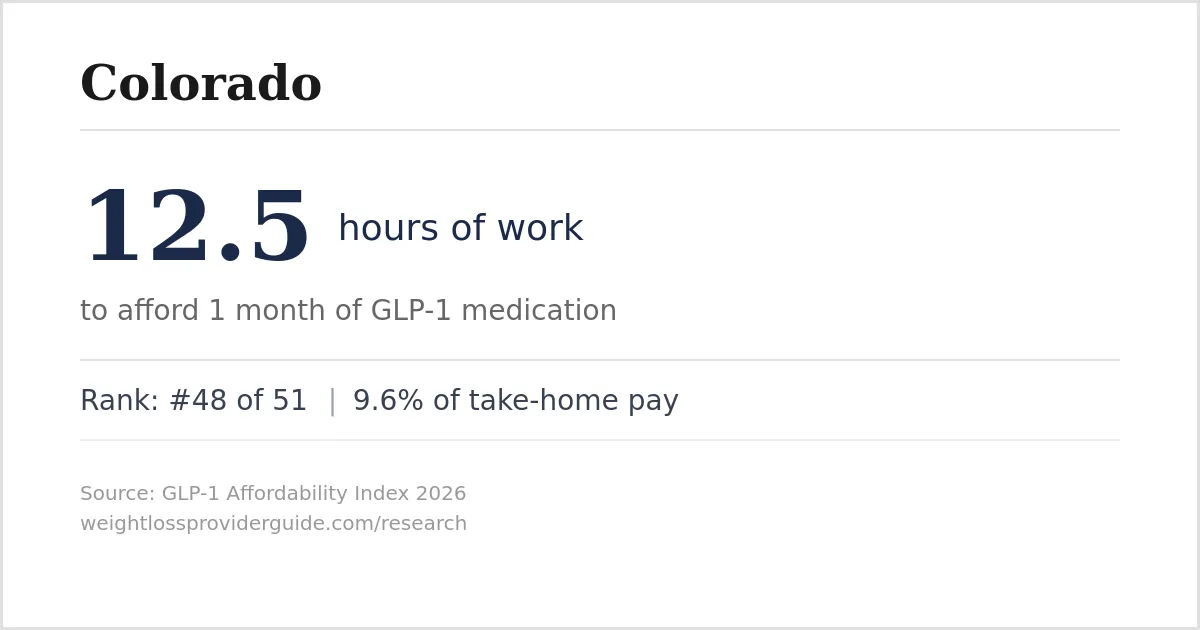 <img src="https://weightlossproviderguide.com/research/images/glp1-statcard-colorado.webp" alt="Colorado GLP-1 Affordability: 12.5 hours of work per month" width="1200" height="630"> <p>Source: <a href="https://weightlossproviderguide.com/research/glp1-affordability-index/colorado/">GLP-1 Affordability Index</a>, 2026</p>