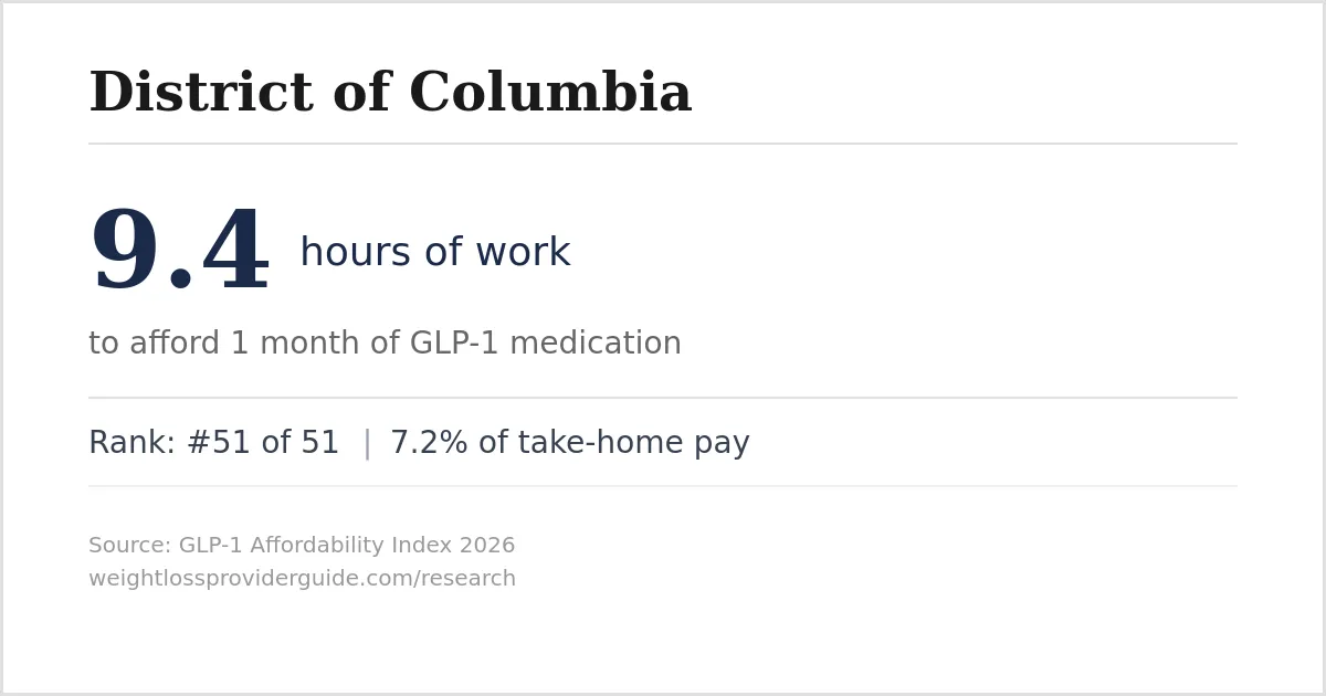 <img src="https://weightlossproviderguide.com/research/images/glp1-statcard-district-of-columbia.webp" alt="District of Columbia GLP-1 Affordability: 9.4 hours of work per month" width="1200" height="630"> <p>Source: <a href="https://weightlossproviderguide.com/research/glp1-affordability-index/district-of-columbia/">GLP-1 Affordability Index</a>, 2026</p>