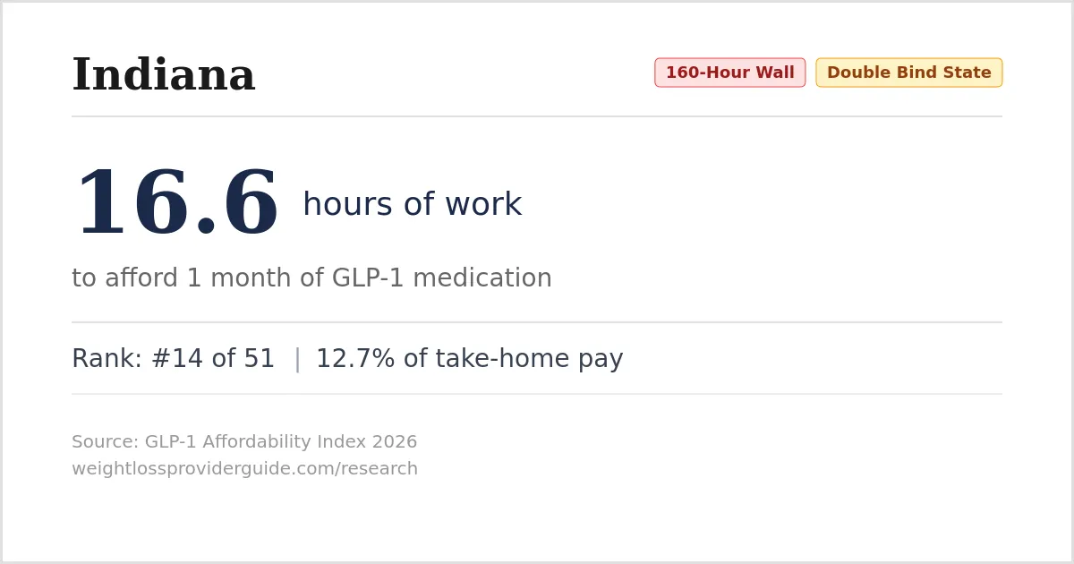 <img src="https://weightlossproviderguide.com/research/images/glp1-statcard-indiana.webp" alt="Indiana GLP-1 Affordability: 16.6 hours of work per month" width="1200" height="630"> <p>Source: <a href="https://weightlossproviderguide.com/research/glp1-affordability-index/indiana/">GLP-1 Affordability Index</a>, 2026</p>