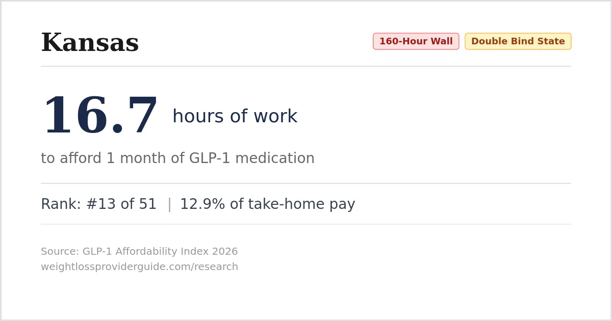 <img src="https://weightlossproviderguide.com/research/images/glp1-statcard-kansas.webp" alt="Kansas GLP-1 Affordability: 16.7 hours of work per month" width="1200" height="630"> <p>Source: <a href="https://weightlossproviderguide.com/research/glp1-affordability-index/kansas/">GLP-1 Affordability Index</a>, 2026</p>