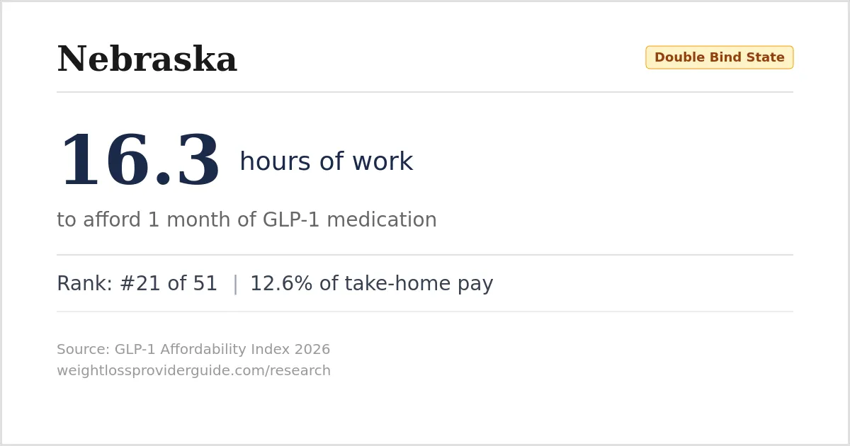 <img src="https://weightlossproviderguide.com/research/images/glp1-statcard-nebraska.webp" alt="Nebraska GLP-1 Affordability: 16.3 hours of work per month" width="1200" height="630"> <p>Source: <a href="https://weightlossproviderguide.com/research/glp1-affordability-index/nebraska/">GLP-1 Affordability Index</a>, 2026</p>