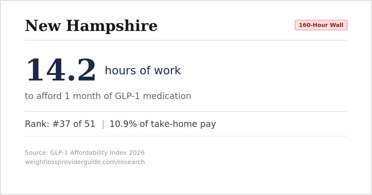 <img src="https://weightlossproviderguide.com/research/images/glp1-statcard-new-hampshire.webp" alt="New Hampshire GLP-1 Affordability: 14.2 hours of work per month" width="1200" height="630"> <p>Source: <a href="https://weightlossproviderguide.com/research/glp1-affordability-index/new-hampshire/">GLP-1 Affordability Index</a>, 2026</p>