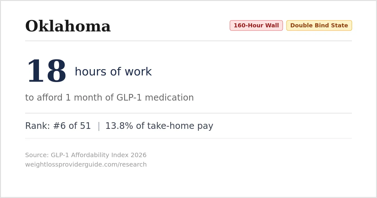 <img src="https://weightlossproviderguide.com/research/images/glp1-statcard-oklahoma.webp" alt="Oklahoma GLP-1 Affordability: 18 hours of work per month" width="1200" height="630"> <p>Source: <a href="https://weightlossproviderguide.com/research/glp1-affordability-index/oklahoma/">GLP-1 Affordability Index</a>, 2026</p>