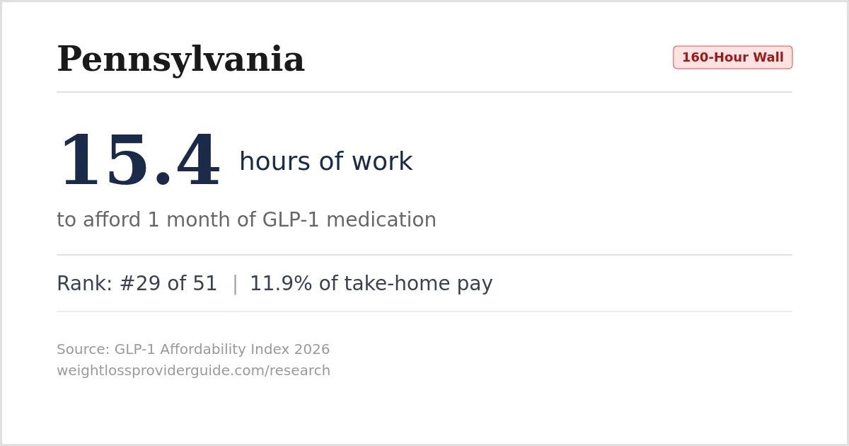 <img src="https://weightlossproviderguide.com/research/images/glp1-statcard-pennsylvania.webp" alt="Pennsylvania GLP-1 Affordability: 15.4 hours of work per month" width="1200" height="630"> <p>Source: <a href="https://weightlossproviderguide.com/research/glp1-affordability-index/pennsylvania/">GLP-1 Affordability Index</a>, 2026</p>