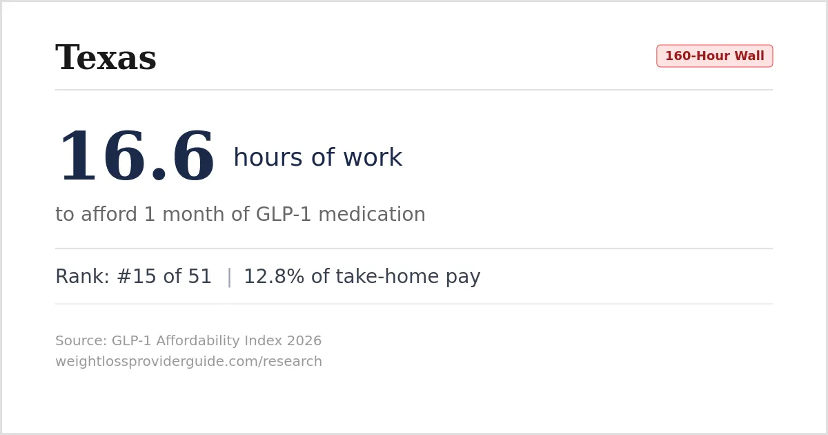 <img src="https://weightlossproviderguide.com/research/images/glp1-statcard-texas.webp" alt="Texas GLP-1 Affordability: 16.6 hours of work per month" width="1200" height="630"> <p>Source: <a href="https://weightlossproviderguide.com/research/glp1-affordability-index/texas/">GLP-1 Affordability Index</a>, 2026</p>