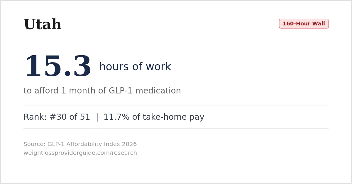 <img src="https://weightlossproviderguide.com/research/images/glp1-statcard-utah.webp" alt="Utah GLP-1 Affordability: 15.3 hours of work per month" width="1200" height="630"> <p>Source: <a href="https://weightlossproviderguide.com/research/glp1-affordability-index/utah/">GLP-1 Affordability Index</a>, 2026</p>
