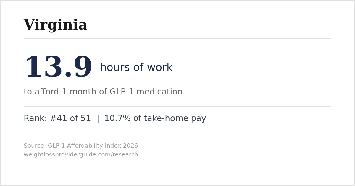 <img src="https://weightlossproviderguide.com/research/images/glp1-statcard-virginia.webp" alt="Virginia GLP-1 Affordability: 13.9 hours of work per month" width="1200" height="630"> <p>Source: <a href="https://weightlossproviderguide.com/research/glp1-affordability-index/virginia/">GLP-1 Affordability Index</a>, 2026</p>