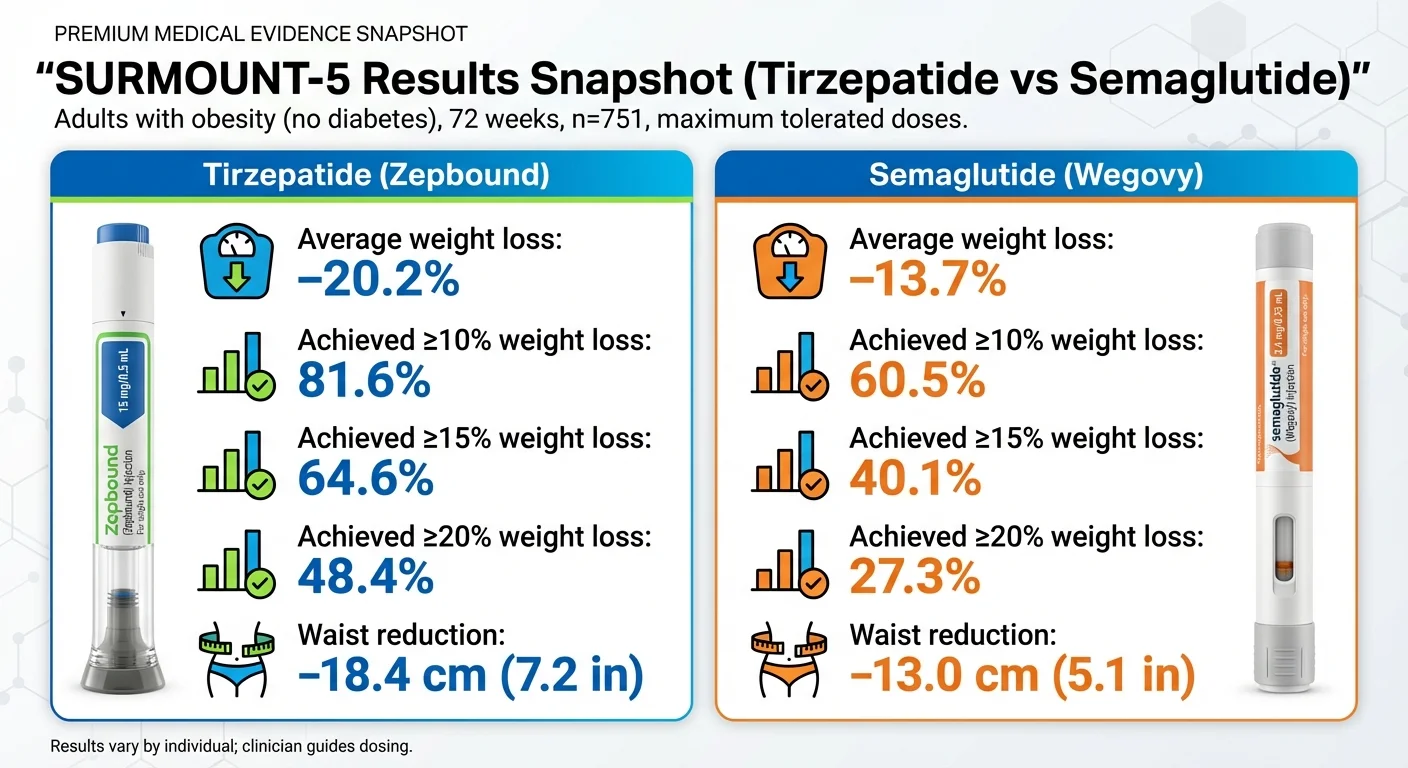 When semaglutide (Ozempic/Wegovy) launched, it was revolutionary. Average weight loss of 12-15% was unprecedented for a medication. But tirzepatide changed the math. The dual-agonist mechanism consistently delivers 15-20% weight loss in real-world settings — and the SURMOUNT-5 trial showed it beating semaglutide head-to-head by a wide margin.