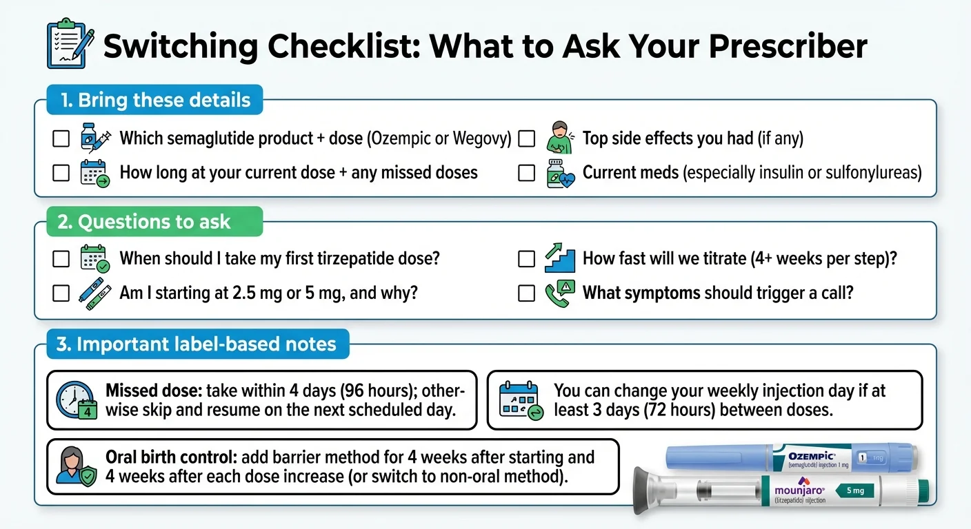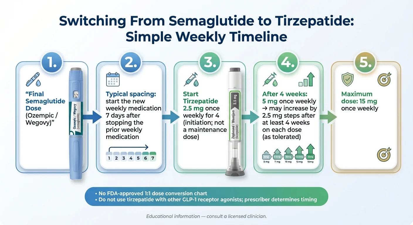 - The timeline is simple: last semaglutide dose, wait ~7 days, start tirzepatide at 2.5 mg