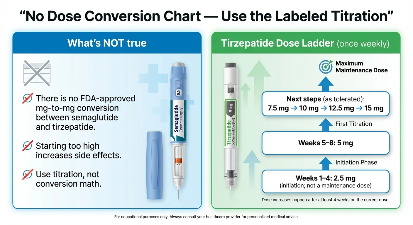 There is no FDA-approved dose conversion between semaglutide and tirzepatide. They work through different mechanisms, and starting at too high a dose is the number-one reason people feel terrible after switching. We'll show you exactly why — and what to do instead.
