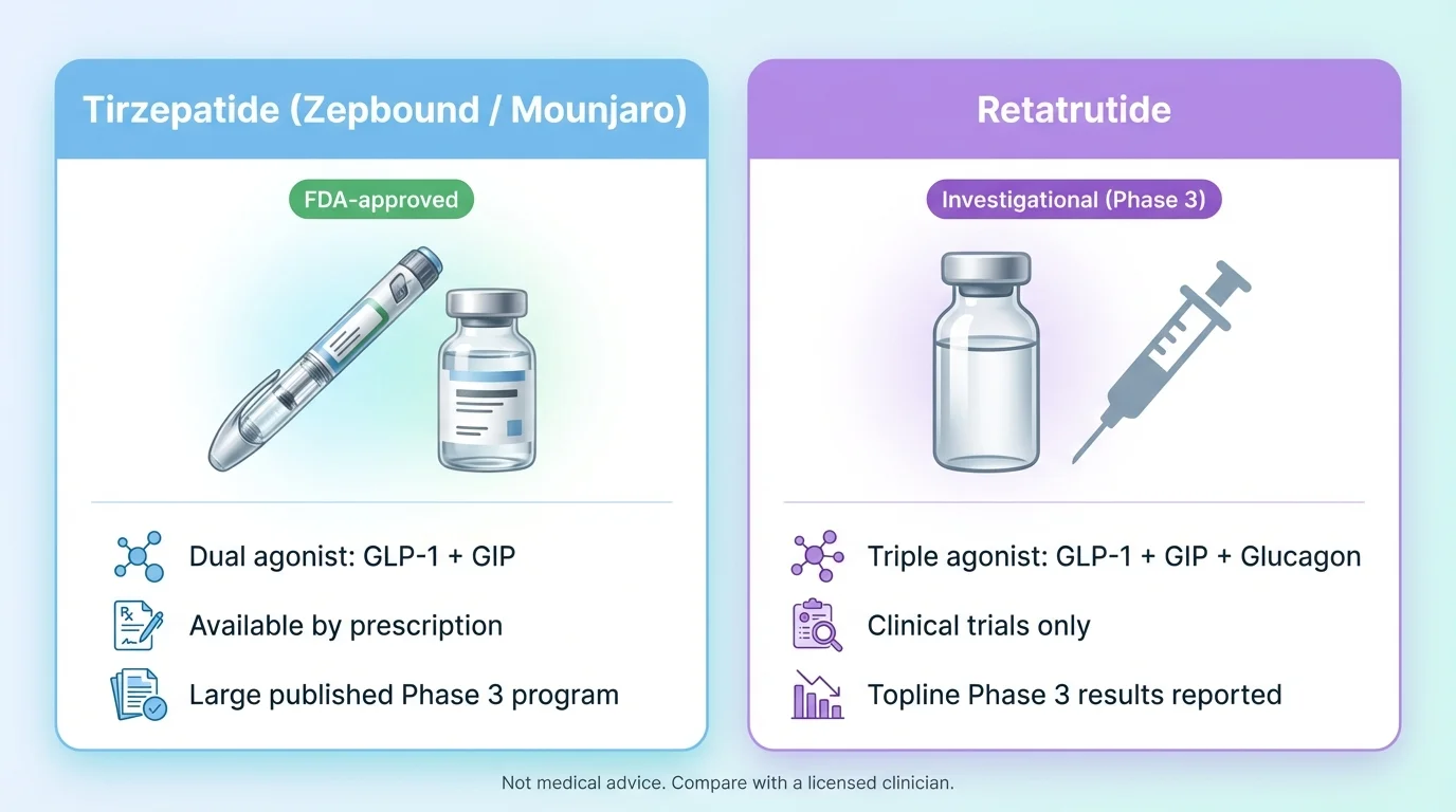 | Category | Tirzepatide (Zepbound / Mounjaro) | Retatrutide (LY3437943) | What This Means for You |