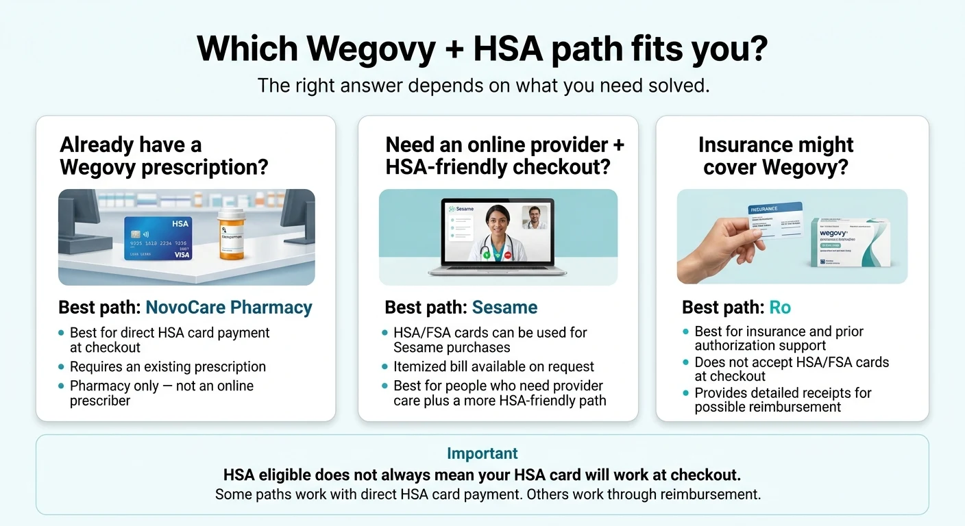 The right Wegovy + HSA path depends on whether you already have a prescription, need a new provider, or suspect insurance might cover part of the cost. HSA eligible does not always mean your HSA card will work at checkout — some paths work through reimbursement.