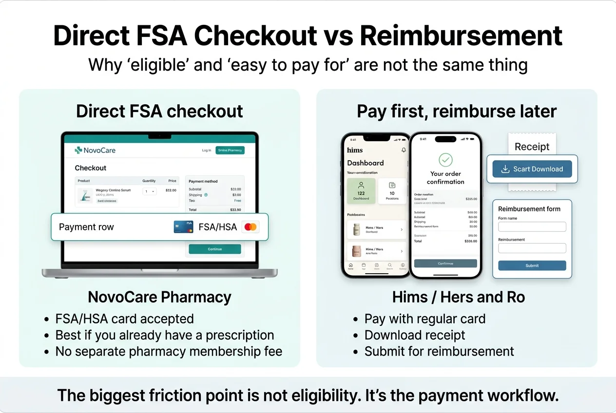 - Hims/Hers and Ro: Reimbursement-first. Pay with a regular card, download receipt, file with your FSA administrator. Ro does not accept FSA cards at all.