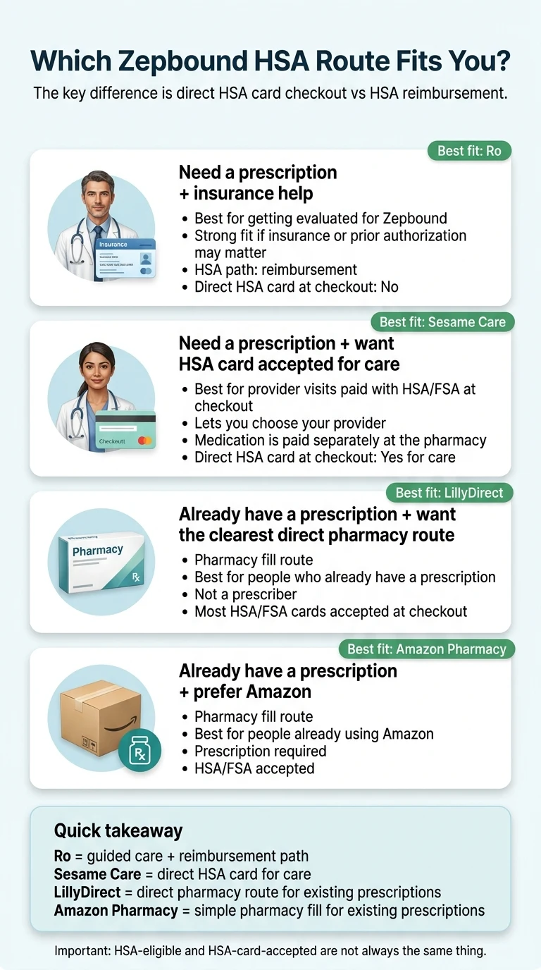Five routes cover virtually every reader searching “Zepbound providers that accept HSA.” The critical split is whether you need a new prescription or already have one — that cuts the five routes to two or three immediately.